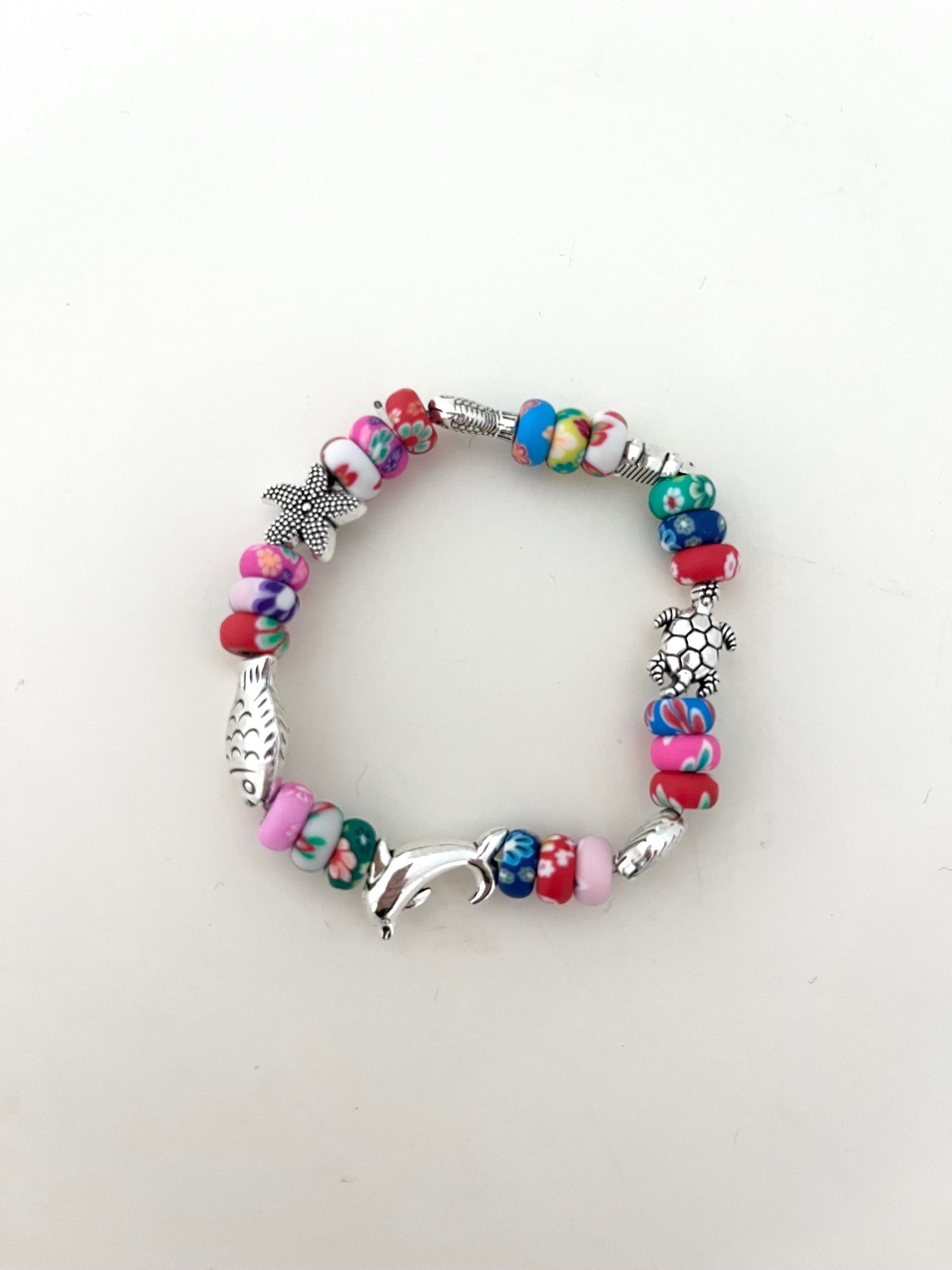 Create a super cute bracelet with colourful polymer clay beads and ocean related metal beads like fish, turtles and seashells.