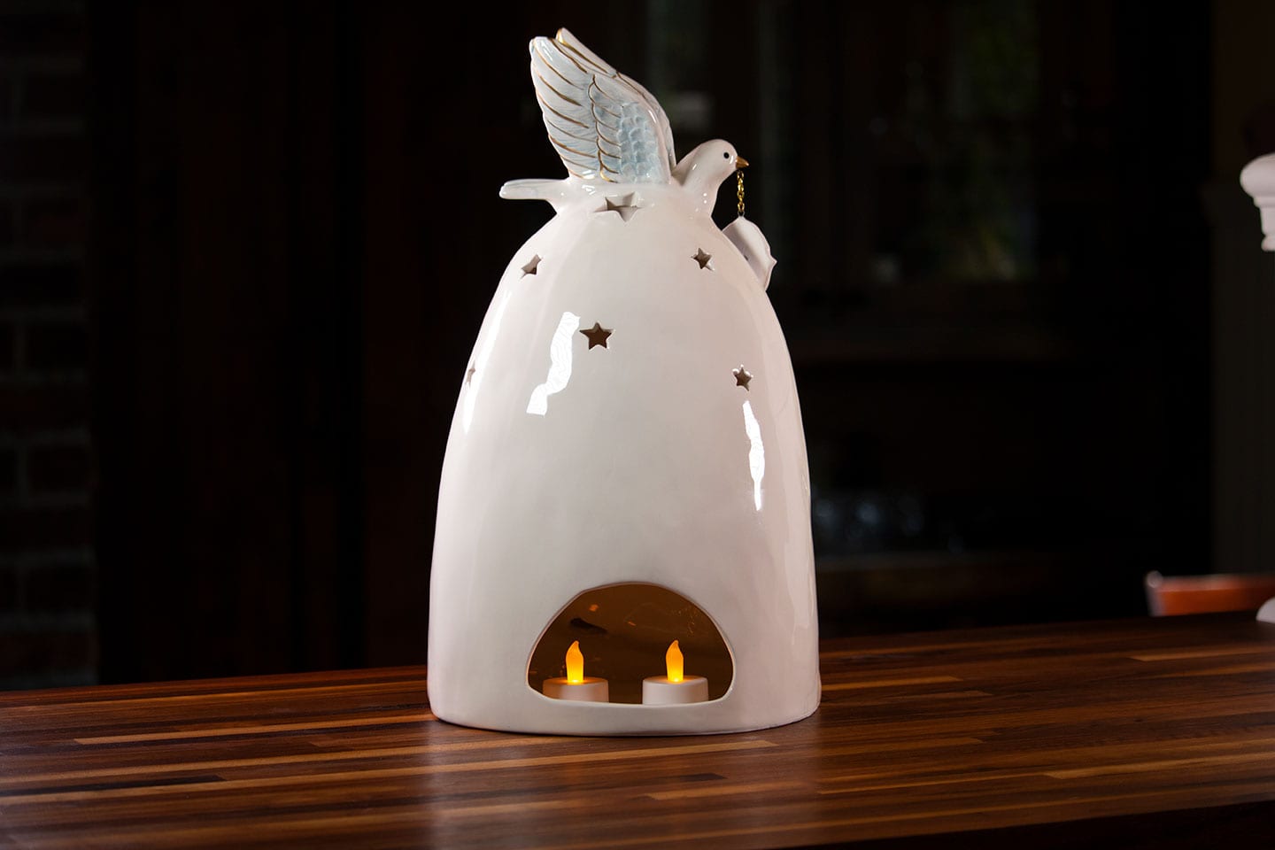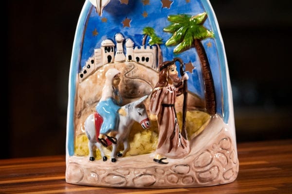 This Clayworks Bethlehem Nativity tealight holder is beautifully accented with a large dove hovering over Mary and Joseph on their way to Bethlehem. This will be an stunning addition to your Christmas mantle.