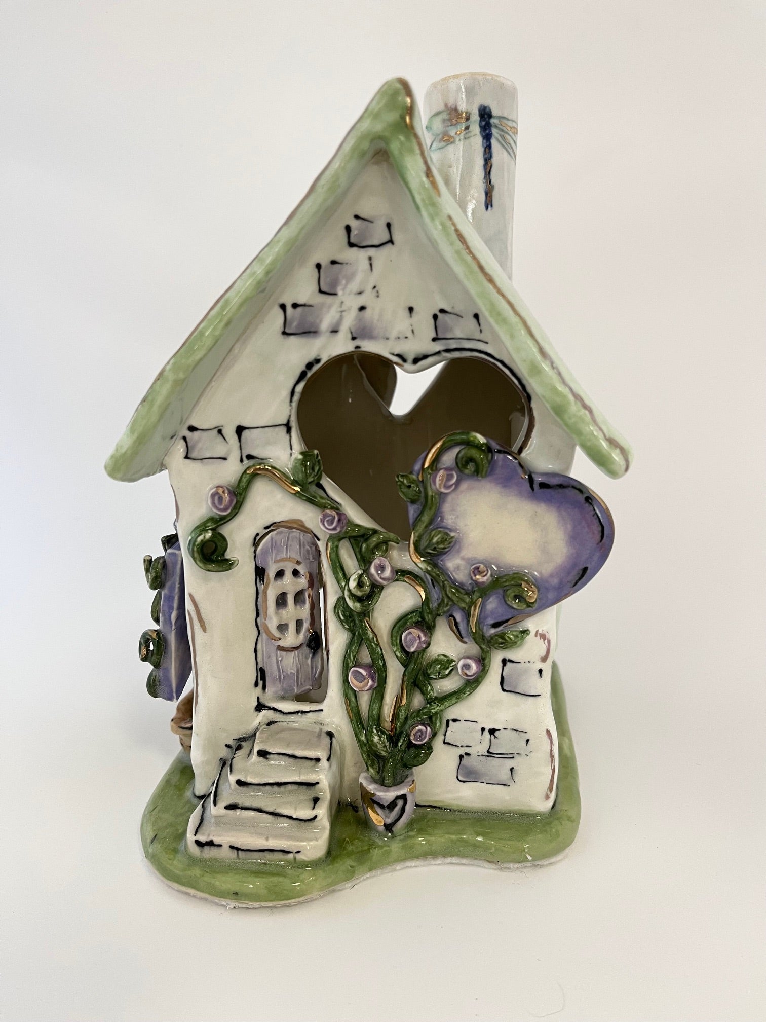 This studio made candle house is expertly finished with hand painted details, beautiful purple roses and crisp mint green accents. Trimmed with 22k gold.